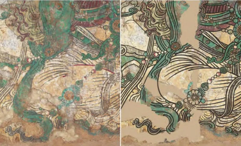类似的误读不止一处。主尊右下方胁侍菩萨的腿部,修复师将结构线与衣纹线混淆,改变了线条的运动轨迹,还影响到相邻菩萨的站姿。张见团队重新调整后,两位胁侍菩萨呈现镜像式站姿,略微侧身,面向主尊,整个画面更具均衡感。