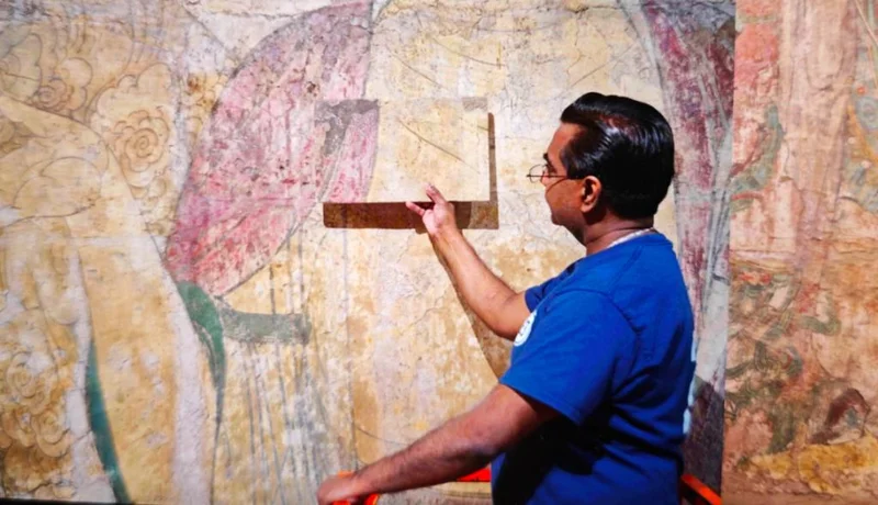 临摹的过程中,校色是第一道难关。团队选出壁画中多处具有代表性的点位,现场在泥板上绘制,调色、比对、修改,直到与大都会原壁的相似度达到98%左右。这些样板带回北京后将成为后来确定壁画色彩的依据。