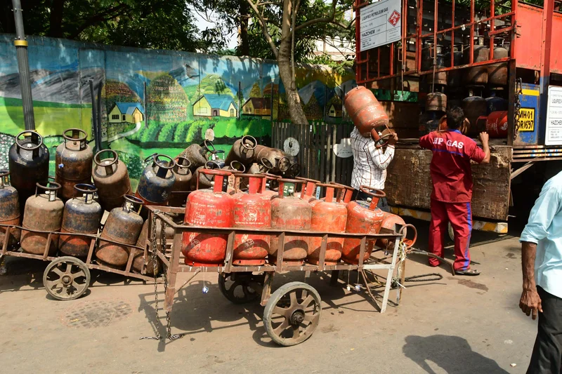 2026年3月24日,印度孟买,工人正从供应卡车上卸载液化石油气钢瓶并搬运至三轮车。受中东局势升级影响,霍尔木兹海峡周边航运路线受阻,而该海峡是印度进口大量液化石油气的通道。视觉中国/图