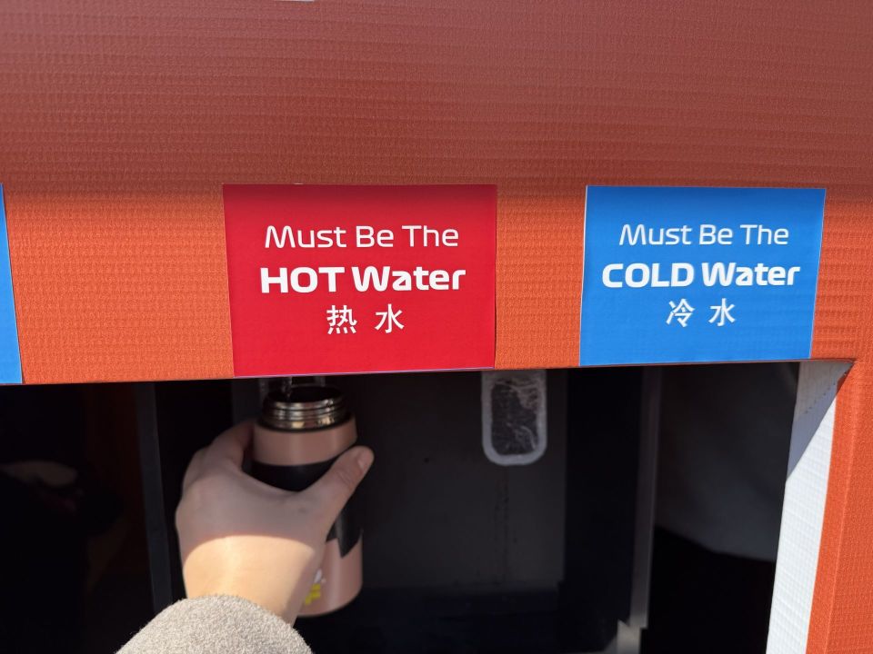 出水口上方贴着两行字:“Must Be The Hot Water”、“Must Be The Cold Water”。“Must be the water”是车手勒克莱尔在2025年比赛中和工程师的无厘头对话,唯有懂这个梗的车迷看到,才会会心一笑。