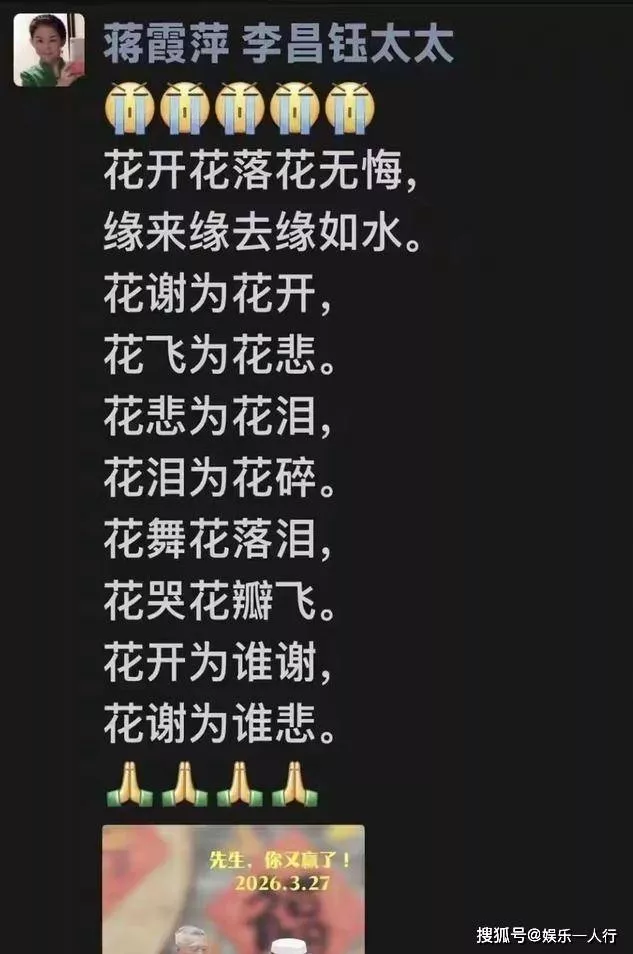 所以,当3月27日李昌钰在家中安详离世后,妻子蒋霞萍在朋友圈发的悼念内容,没有长篇的讣告,只有一首小诗和一张照片。照片里,两人在玩剪刀石头布,李昌钰出了“布”,赢了出“剪刀”的蒋霞萍。照片上配着一行字:“先生,你又赢了!”这句看似平常的话,放在生死离别的背景下,瞬间击中了无数人。它像是一个只有他们两人才懂的暗号,一个关于谁先离开的约定。有网友猜测,也许他们约定过,游戏赢的人可以先走。这一次,是他赢了。