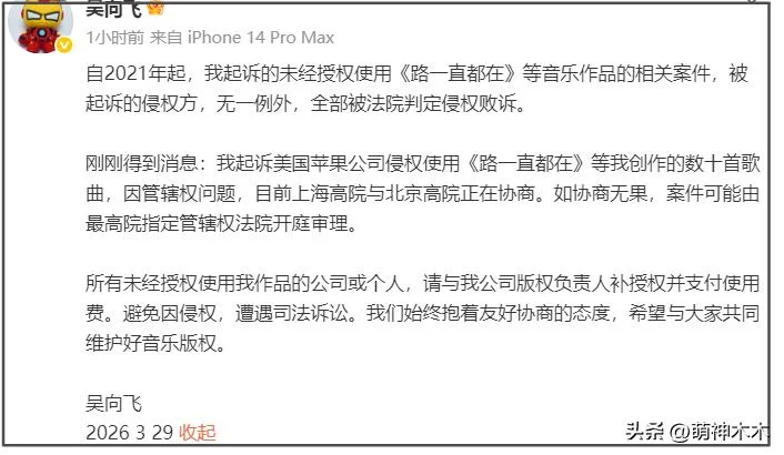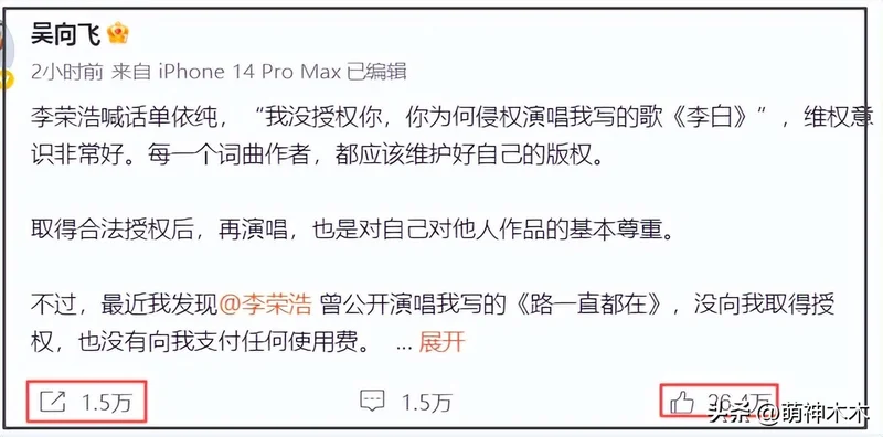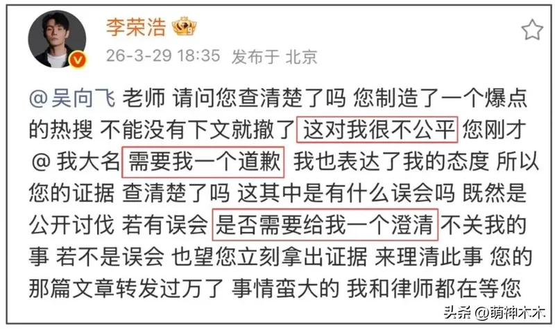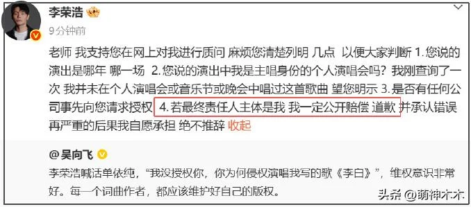 当然,李荣浩并不是软柿子,他再次发文回应吴向飞,不给任何模糊空间。多次要求对方彻查清楚版权问题,不然让他挂热搜不公平,而如果公开讨伐是误会一场,要求吴向飞公开道歉,毕竟转发都过万了影响力太大,自己跟律师都等着他解释。