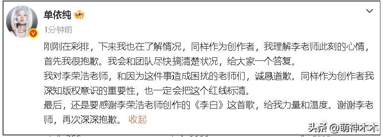 同时,当李荣浩被另一个音乐人吴向飞质疑侵权时,他大方支持对方的质问,并向对方索要具体的演出时间等,表示若自己是责任人主体一定公开赔偿道歉,绝不推辞任何后果。这般真诚与单依纯形成了强烈对比,侵权与否是是非题,不需要模棱两可的说辞。之后吴向飞却选择了回避,似乎没想到本人会回复。