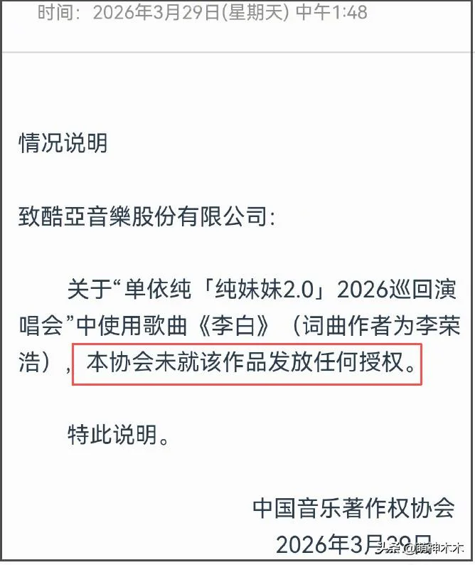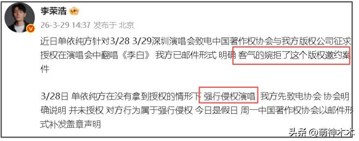 细看李荣浩的维权文,每一篇都戳中要害,让单依纯及团队避无可避侵权问题,不仅表明了自己婉拒单依纯演唱会翻唱授权请求,还晒了中国著作权协会的“未就《李白》发放任何授权”的确认邮件,不让对方糊弄侵权案。