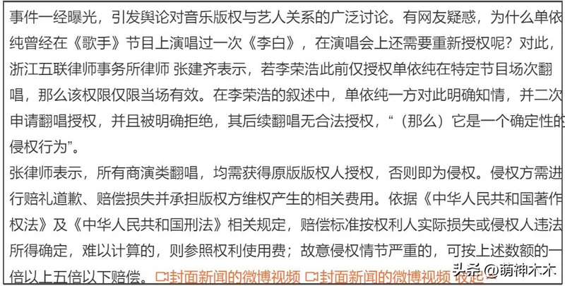 关于单依纯的侵权行为,专业律师根据李荣浩的控诉进行了详细解读,指出单依纯方知道在《歌手》的演唱版权是单次行为,于是申请了二次翻唱授权,结果单依纯无版权强行翻唱就是一个确定性的侵权行为,而且很可能是恶意的。