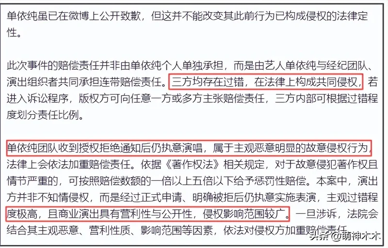 律师还强调,尽管单依纯公开致歉,但并不能改变侵权行为的法律定性。而且这起侵权案责任方有单依纯、经纪团队和演出组织者,属于共同侵权,都需要担责。由于单依纯方明知故犯,律师表示属于主观恶意故意侵权行为,且属于商业性质侵权,影响很大,法律上会加重赔偿责任。