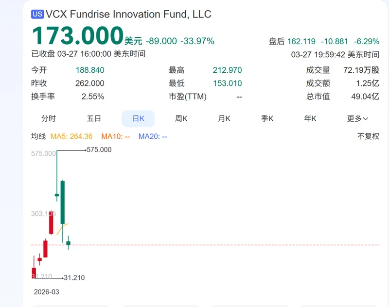 3月19日,VCX正式登陆纽交所。市场瞬间就疯了。开盘价31.25美元,一周内最高冲到575美元,涨幅超过1700%,直接把2026年美股IPO市场的热度拉满。
