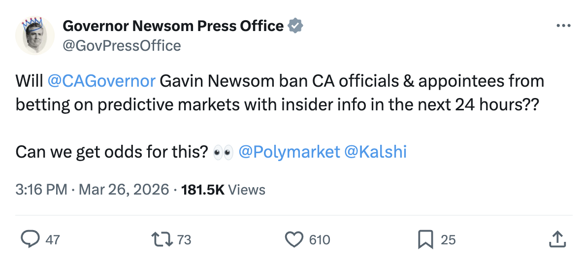 值得注意的是,纽森办公室甚至在社交平台上半开玩笑地发问:“州长在24小时内禁止内幕交易的概率是多少?”
