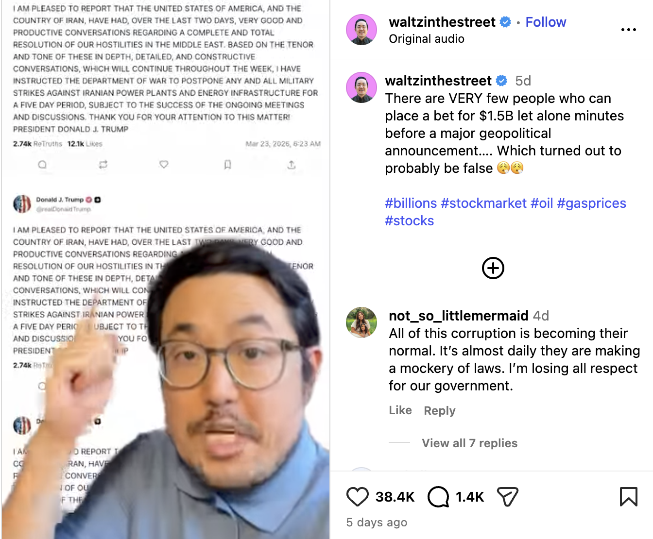 随着相关消息发酵,美股短时间内出现明显反应,而这笔交易据估算在短短20分钟内就可能获利数亿美元。如此“踩点式”操作迅速引发外界质疑:这究竟是高明判断,还是有人提前获取了未公开信息?尽管伊朗方面随后否认相关谈判进展,但舆论已经开始发酵,有网友直言:“这已经不是运气问题了,而是信息不对称。”也有人愤怒表示,“普通人根本没有机会参与这样的游戏。”