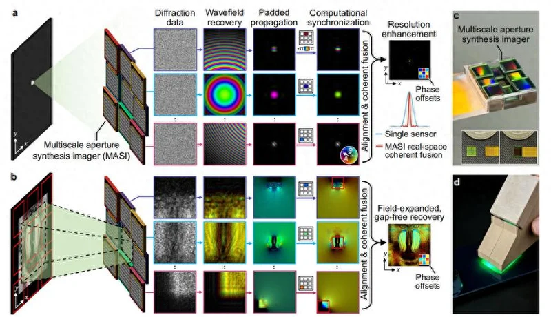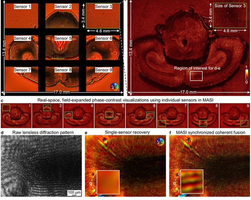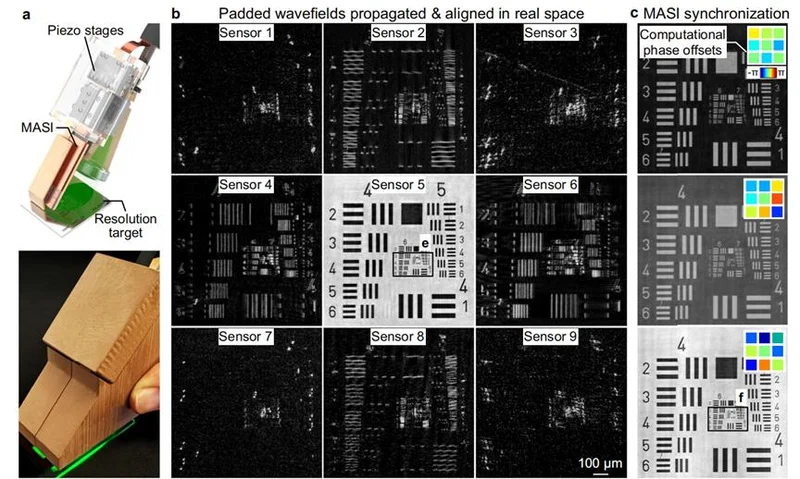 MASI 先指定一块芯片当基准,然后让计算机自动算出其他八块芯片应该调整多少相位差,才能让所有光波在重建时步调一致地叠加起来。这个过程不需要任何重叠的拍摄区域,也不需要参考光,纯粹靠算法把九路信号对齐。