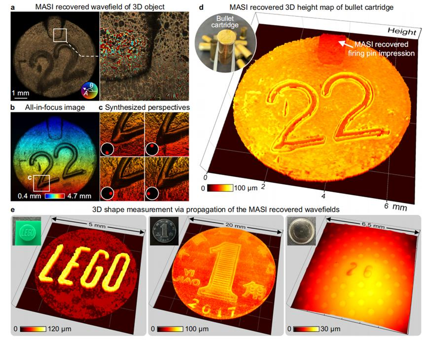 MASI 还能用来做 3D 成像。他们拍了乐高积木上的凸起字母、硬币上的浮雕花纹、电池表面的细微纹理,全都能变成 3D 图像。值得一提的是,他们把一个子弹壳放在光路里,MASI 拍下光波后,计算机在数字空间里把波面一层一层往后推,每一层都能算出哪部分最清晰,最后合出一张 3D 高度图。子弹壳上撞针留下的凹坑和精细的表面纹路,照样被完整还原出来。