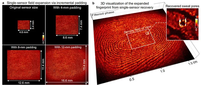 他们团队用 MASI 拍了一个人的指纹,单个传感器的尺寸只有 4.6 乘以 3.4 毫米,只能拍到指纹的一小部分。但是,他们通过计算场扩展的方法,把芯片捕捉到的光波信息往四周数字外推,再反向传播回物体平面,由原本单个芯片采集到的一小部分信息,最终扩展出了一张 16.6 乘 15.4 毫米的完整指纹图,成像面积扩大了 16 倍,指纹上的脊线和汗孔都看得一清二楚。