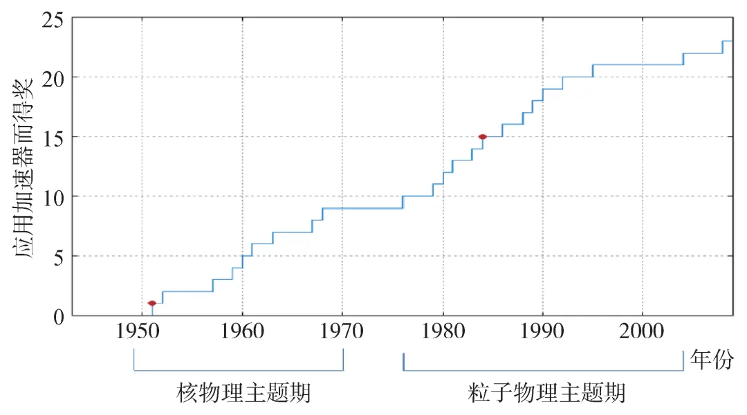 图4 因加速器的突破而产生的诺贝尔物理学奖占所有诺贝尔物理学奖中的28%。横轴为年份,纵轴标示出因加速器的进展而得到诺贝尔奖的积累数。图下方标示出物理学发展中不同的主题期。主题基本上以30—40年为一期,但是每当主题转换之后,加速器作为物理进展驱动主力的情况不变