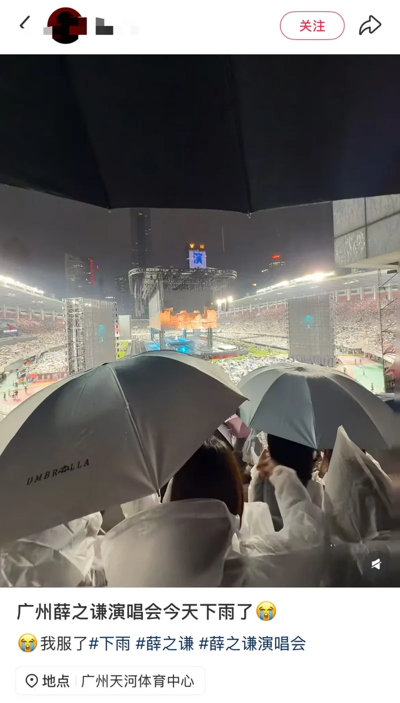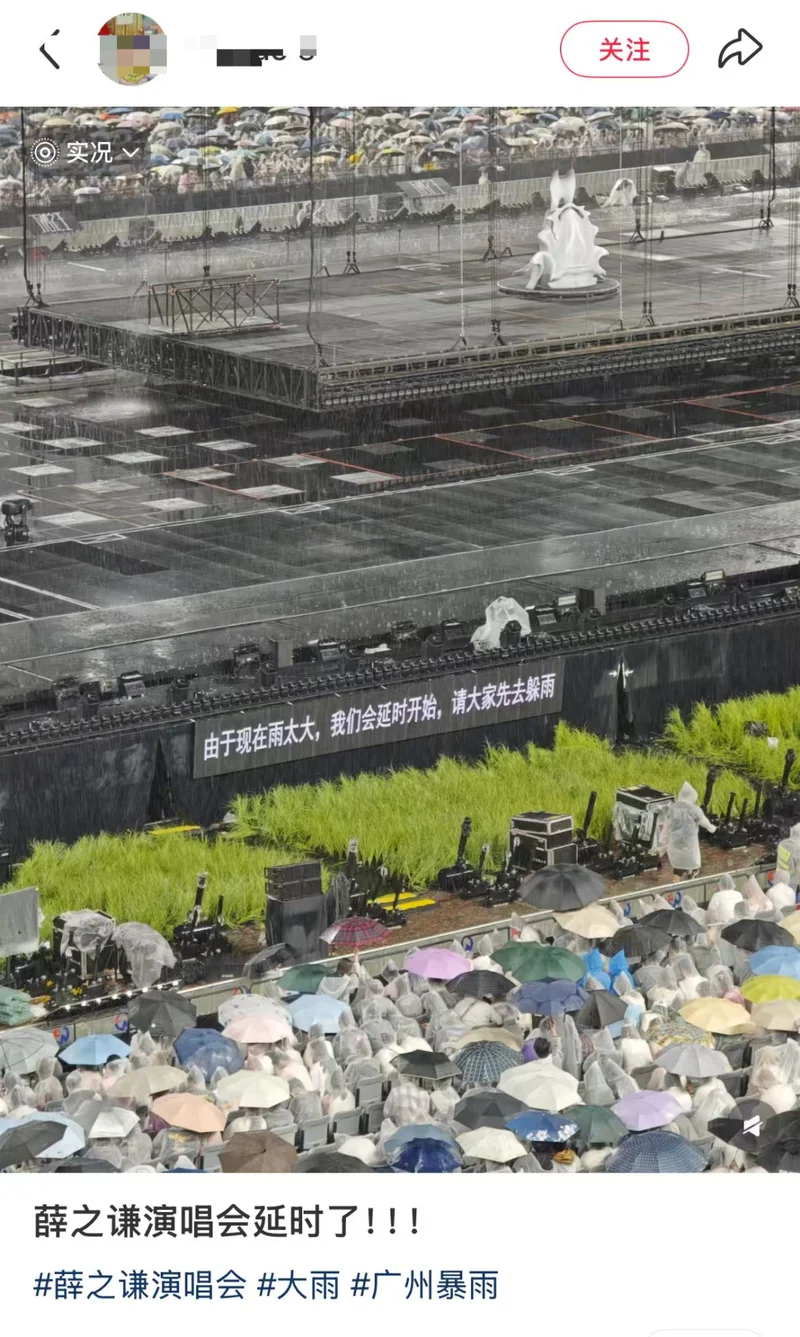 据了解,广州是薛之谦“万兽之王”世界巡回演唱会的首站,在广州天河体育中心共开9场,3月29日晚为第6场。当晚现场视频显示,由于广州下起暴雨,演唱会宣布延迟开场。演唱会开始后,不少内场观众冒雨观演,灯光、屏幕等设备也因下雨出现故障,无法正常运转。