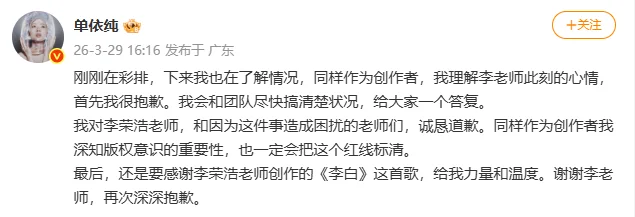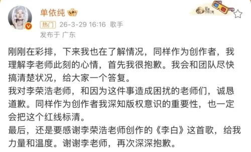 刚刚,单依纯发文回应:“刚刚在彩排,下来我也在了解情况,同样作为创作者,我理解李老师此刻的心情,首先我很抱歉。我会和团队尽快搞清楚状况,给大家一个答复。我对李荣浩老师,和因为这件事造成困扰的老师们,诚恳道歉。同样作为创作者我深知版权意识的重要性,也一定会把这个红线标清。