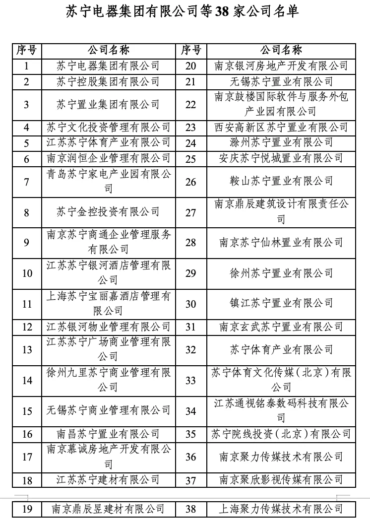 苏宁电器集团有限公司等38家公司名单