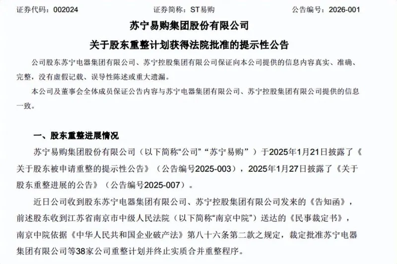 时间线拉回2026年1月,南京市中院裁定苏宁系38家公司实质合并重整计划获批。2月26日,法院公告显示:苏宁易购及关联方涉及的2387.12亿元全口径债务,重组方案已全部执行完毕。