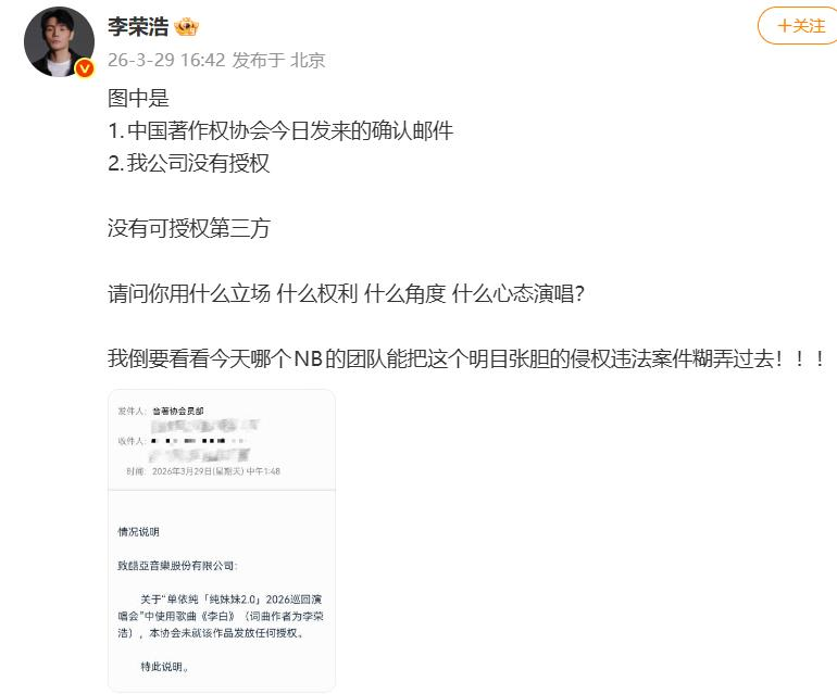 随后,李荣浩再发著作权协会情况说明,控诉单依纯:请问你用什么立场?什么权利?什么角度?什么心态演唱?
