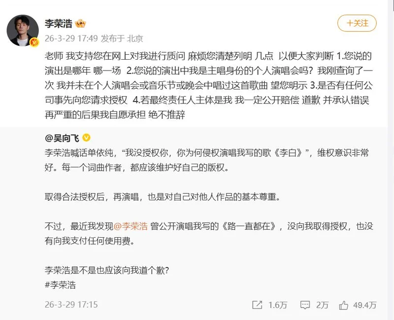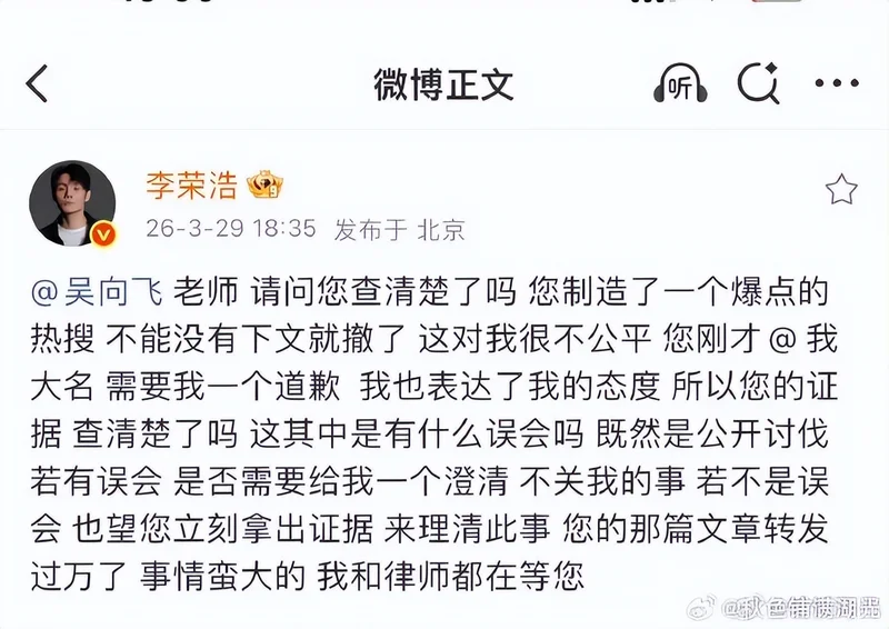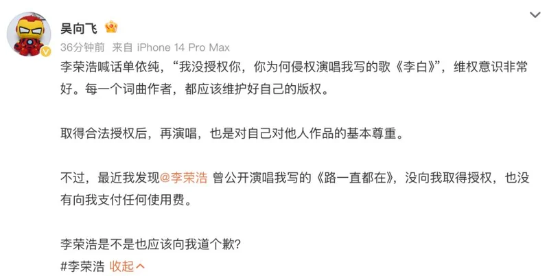 随后,李荣浩接着@吴向飞并发文称:“请问您查清楚了吗?您制造了一个爆点的热搜,不能没有下文就撤了,这对我很不公平。您刚才@ 我大名,需要我一个道歉,我也表达了我的态度。所以您的证据查清楚了吗?这其中是有什么误会吗?既然是公开讨伐,若有误会,是否需要给我一个澄清,不关我的事;若不是误会,也望您立刻拿出证据来理清此事。您的那篇文章转发过万了,事情蛮大的,我和律师都在等您。”