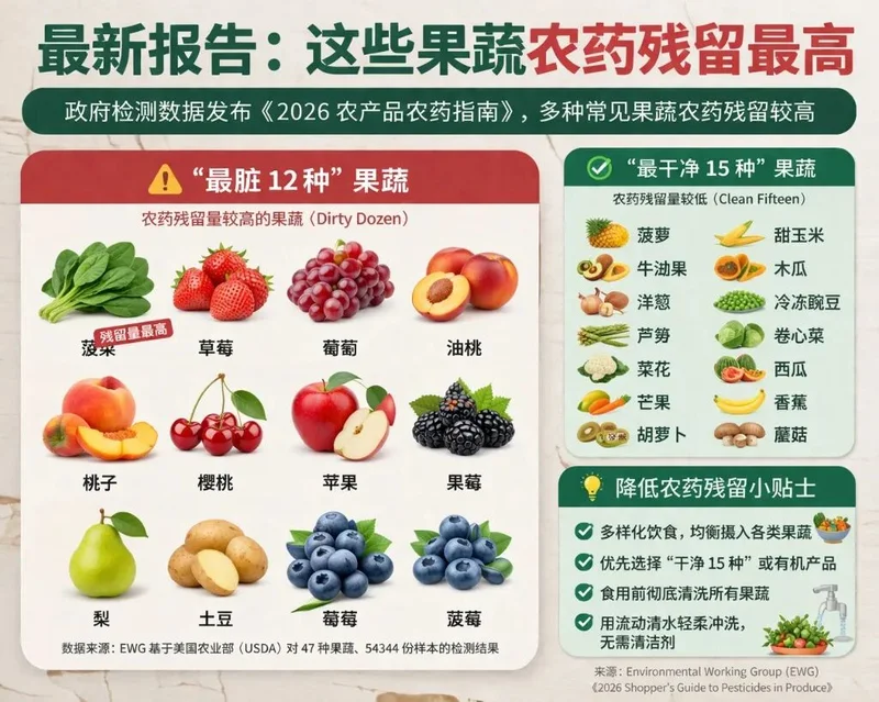 一项基于政府检测数据的最新报告显示,日常餐桌上常见的多种果蔬存在较高农药残留,其中菠菜、草莓和葡萄等位列“高风险榜单”前列,引发公众关注。