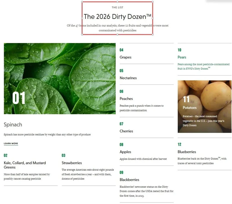 报告将农药残留最高的果蔬列为“Dirty Dozen(最脏十二种)”,包括:菠菜草莓葡萄油桃桃子樱桃苹果黑莓梨土豆蓝莓