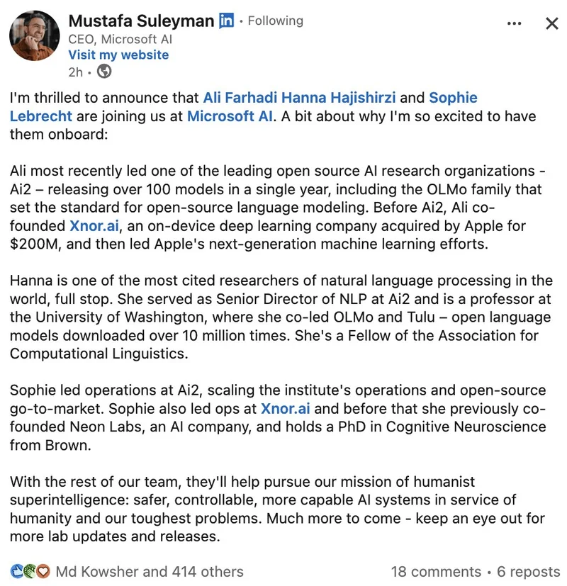 Ai2前CEO阿里·法哈迪、前首席运营官索菲·莱布雷希特、汉娜·哈吉希尔齐和兰杰·克里希纳,统统被苏莱曼打包进了微软。