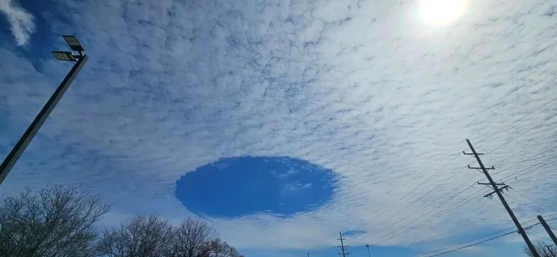 芝加哥西郊上空近期出现了一种特殊的自然景观,多位居民拍摄到了形似“圆孔”的奇特云层。这种被称为“雨幡洞云”(fallstreaks)或“穿孔云”的现象极其罕见,其形成需要极其严苛的气象条件。