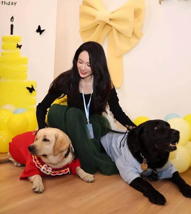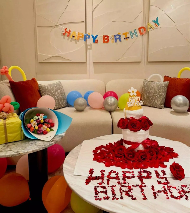 生日现场布置格外用心,“HAPPY BIRTHDAY”的气球与彩带装点着四周,还有可爱的生日蛋糕和两只穿着喜庆服饰的爱犬也陪伴左右,温馨又热闹。