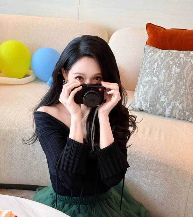另一组照片里,陈乔恩换上黑色露肩上衣搭配墨绿色纱裙,手持复古相机,时而低头浅笑,时而举相机定格美好,灵动的模样完全看不出岁月痕迹,少女感扑面而来。