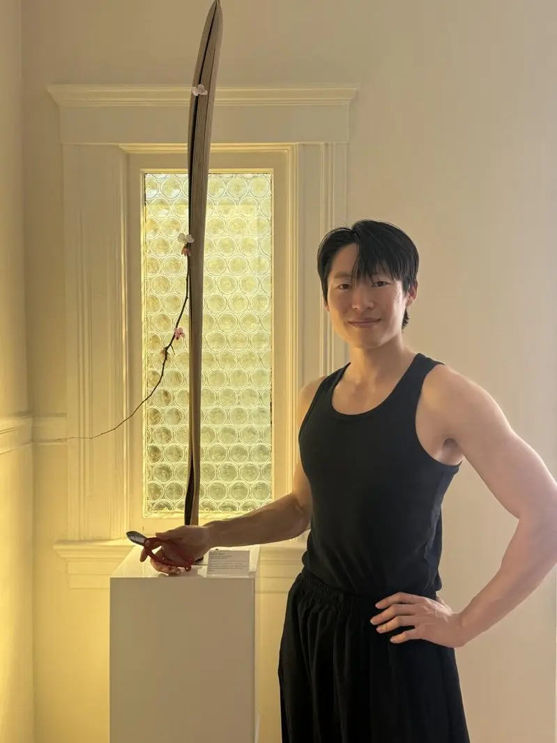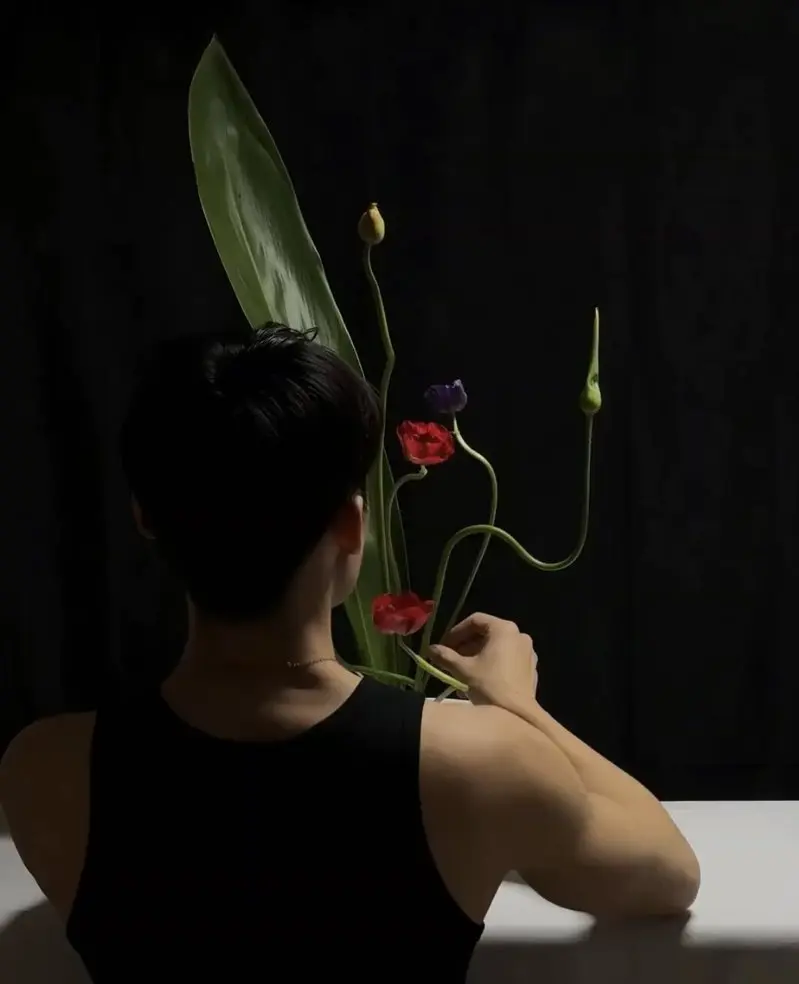 在灯光柔和的室内空间里,一株高挑的荷叶与几枝弯曲生长的花茎,在黑色背景中静静伸展。一名年轻男子专注地调整花材,动作缓慢而精准,台下观众屏息凝视。这不是传统意义上的艺术展,而是新世代移民孙兆泽(Peter Sun)正在用花艺讲述他的生命故事。