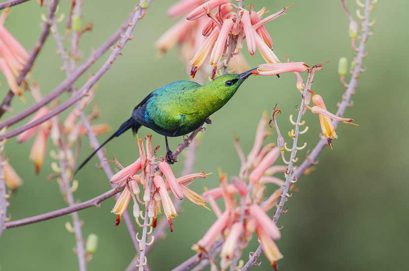 孔雀石色花蜜鸟以芦荟花为食。图片来源:Nick Garbutt/NPL/Minden