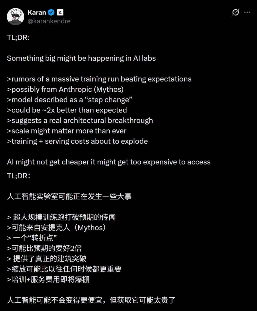三周前那个疯狂传言,如今被Mythos彻底印证?Anthropic或已完成史上最大规模训练,新模型性能或将达到预期的2倍,翻倍碾压Scaling Law!一场颠覆性变革正在降临,算力、能源成为终极筹码,创业公司恐遭毁灭性降维打击!