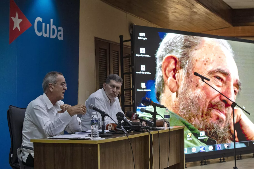 奥斯卡·佩雷斯-奥利瓦·弗拉加(中)于2024年在哈瓦那出席新闻发布会。