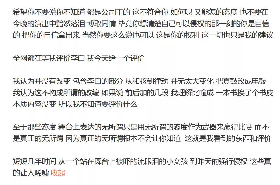 “希望你不要说你不知道 都是公司干的 这不符合你 如何呢 又能怎的态度 也不要在今晚的演出中黯然落泪 博取同情毕竟你想清楚自己可以侵权的那一刻的你是自信的 把你的自信拿出来”