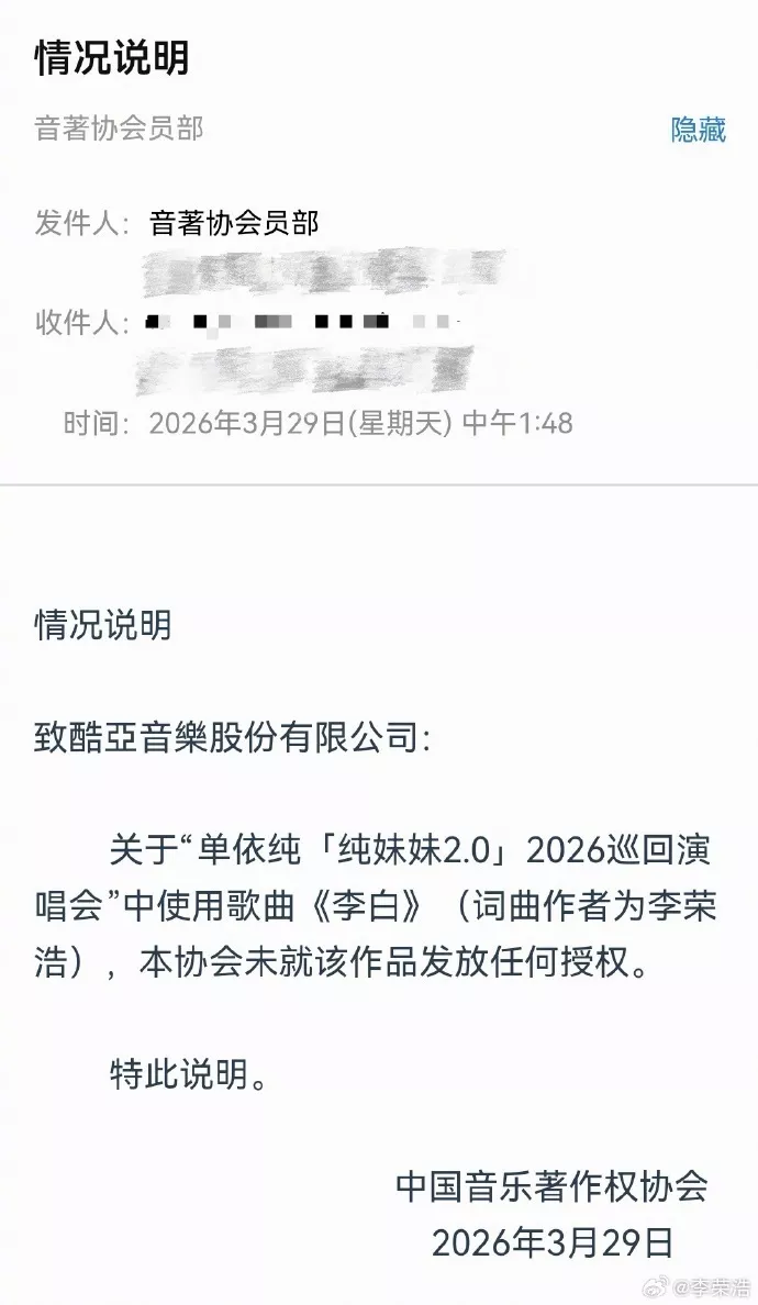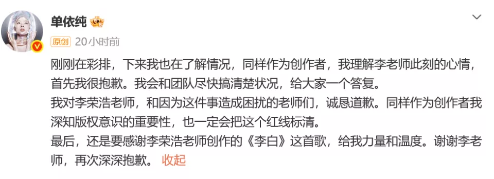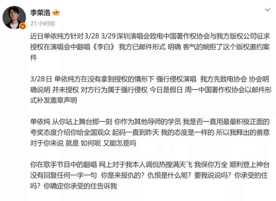 大意是单依纯想在自己演唱会上演唱《李白》这首歌,李荣浩作为创作者明确拒绝了,但单依纯在未获得授权下,还是在演唱会演唱了这首歌。