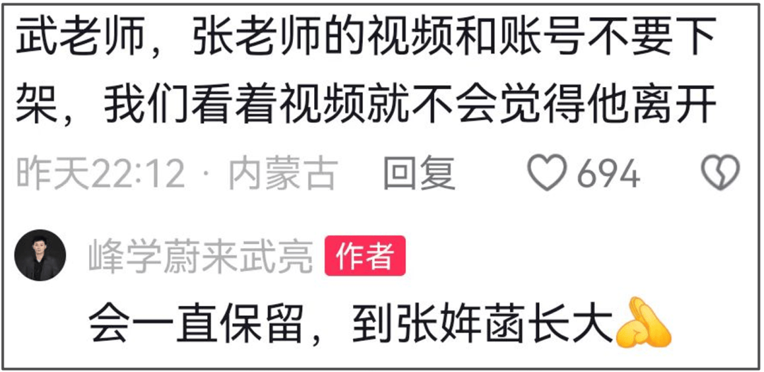 武亮也表示张老师的个人账号作品会一直保留,到张姩菡长大,交到她手里。