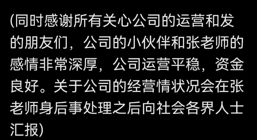张老师公司的总经理武亮发文悼念张老师,回忆了很多两人的相处往事,两人的关系非常好,是兄弟也像父子,武亮也表示这几天收到了不少领导和合作伙伴的鼓励,他承诺一定会把张老师的精神文化传下去,把公司继续做下去,照顾好张老师家人和员工。