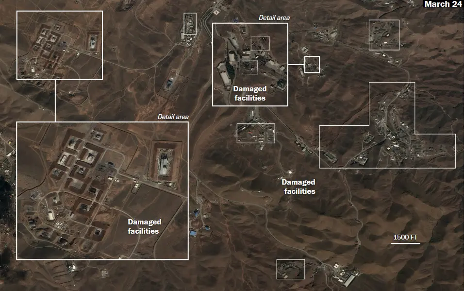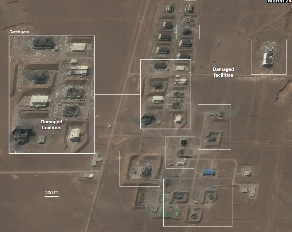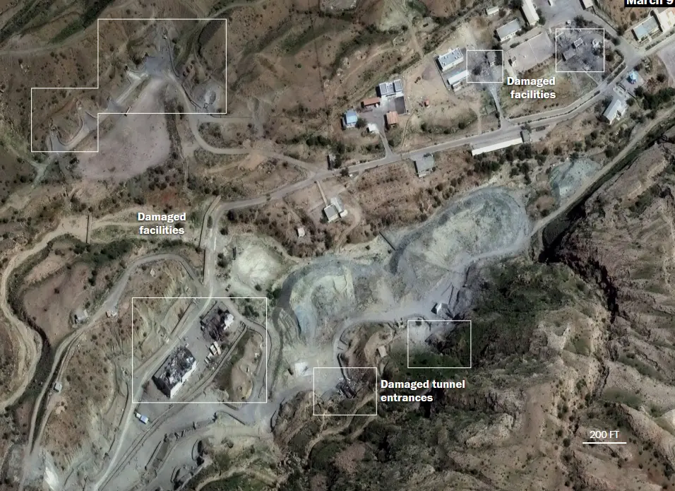 应《华盛顿邮报》的要求,四位专家审查了被美军空袭地点的卫星图像。卫星图像显示,位于德黑兰以东的霍吉尔导弹基地有四个主要区域遭到了美国或以色列的袭击。据詹姆斯·马丁防扩散研究中心的研究员萨姆·莱尔称,此次袭击的目标是该基地用于制造弹道导弹所需固体燃料和液体燃料的各种厂房。