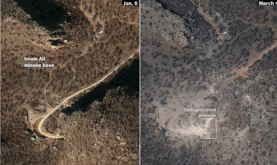 专家称,伊朗弹道导弹发射基地的确切数量未知,但估计约有30个。据专家介绍,这些基地大多有地下导弹储存设施,通过在山腰开凿的隧道进入。卫星图像显示,美国和以色列的袭击已击中许多隧道入口,阻断了通往导弹存放处的通道。