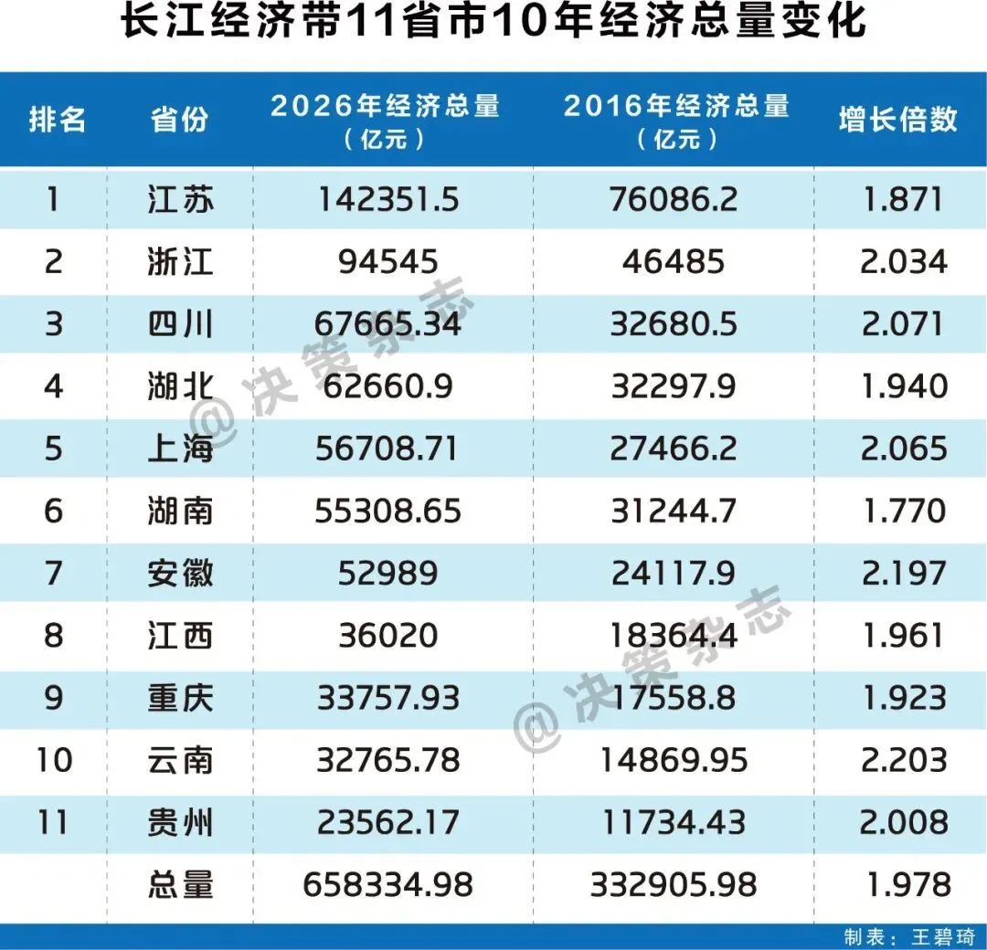 梳理发现,十年来,长江经济带上中游省份增速普遍跑赢下游,云南、安徽、四川领跑11省市;贵州同样势头强劲,增长了2.008倍。