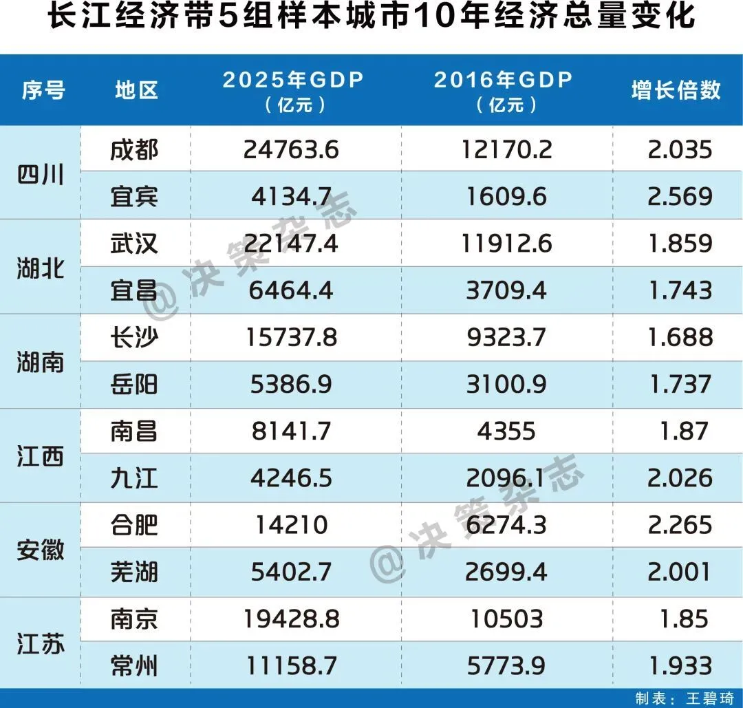 在这批中心城市中,省会城市的能级跃升尤为亮眼。作为区域发展的“领头羊”,十年间它们普遍实现位次前移、体量倍增,成为长江经济带城市崛起的鲜明注脚。