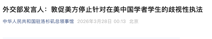 据“外交部发言人办公室”消息,在3月27日举行的外交部例行记者会上,有记者就“一名中国博士后在遭美方执法人员约谈盘问后不幸自杀身亡”一事提问。