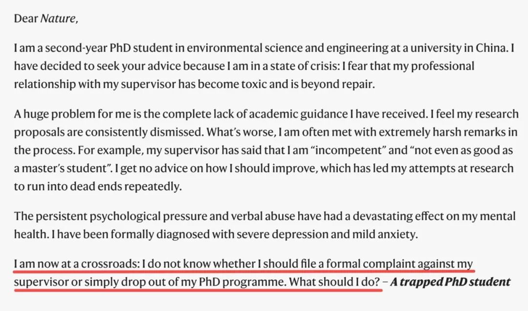 写下这句话的是一名来自中国某高校环境科学与工程专业的二年级博士生。在信中,他讲述了自己如何在导师的言语冷暴力中,一步步滑向精神崩溃的边缘。