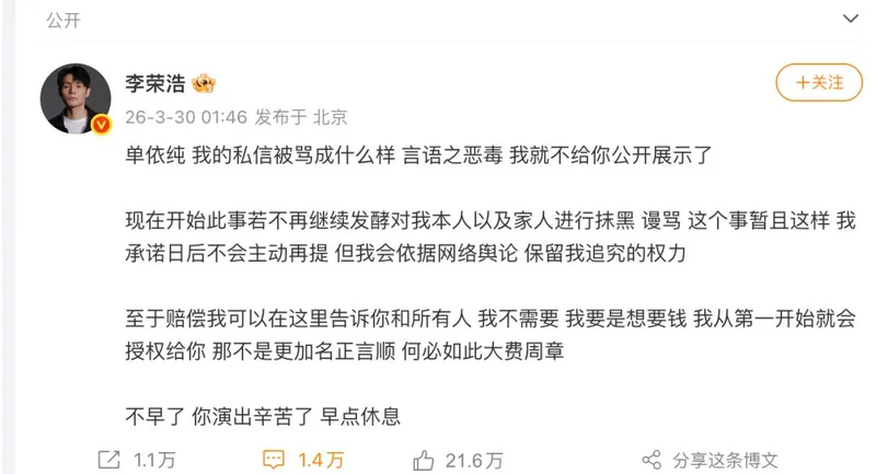 3月29日,@李荣浩公开指控单依纯在深圳演唱会未经授权翻唱《李白》,此事不断发酵。3月30日凌晨1点08分,单依纯发文道歉,随后,1点46分,李荣浩发微博喊话单依纯。