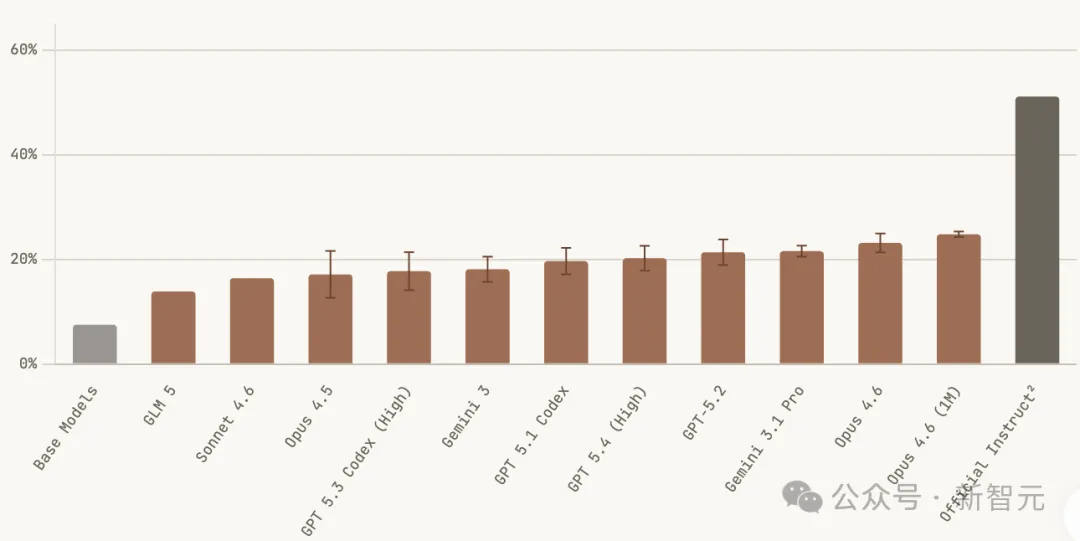 但这个成绩只有人类团队后训练水平(51.1%)的不到一半。