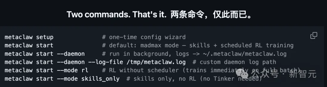 开发者只需输入「metaclaw setup」完成一次性配置,接着输入「metaclaw start --daemon」,系统就会作为一个后台守护进程静默拉起。