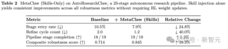 在另一项包含23个阶段的AutoResearchClaw自主研究流水线(涵盖文献综述、实验设计、代码生成、结果分析至论文写作)中,即便不进行权重训练而仅依赖技能注入,系统的综合鲁棒性也提升了18.3%,阶段重试率下降24.8%,迭代优化轮次减少了40%。
