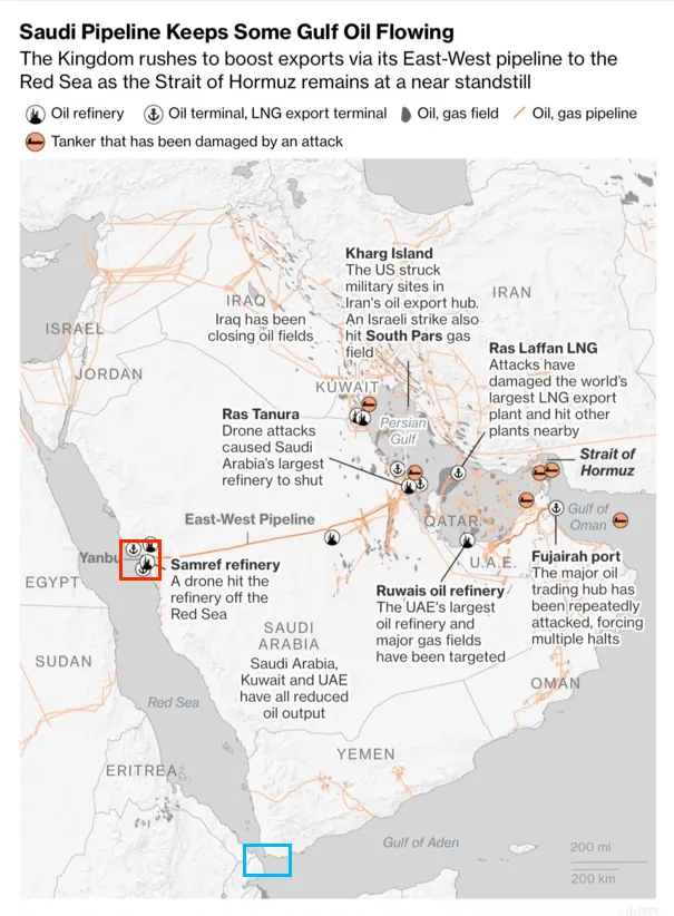在霍尔木兹海峡被封锁后,沙特迅速启动了东西管道,将原油从东部油田穿越1200公里,输送至红海沿岸的延布港出口。延布港的战略价值发生了质变。该港的石油出口从战前日均80万桶,激增至日均500万桶,创历史纪录。