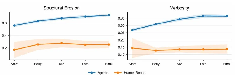 研究者追踪了20个开源仓库好几年的提交记录,发现人类写代码,只要是正经维护的项目,质量基本保持平稳,甚至会越重构越好。但AI写的代码,每迭代一次质量就掉一截,根本没有停下来的意思。