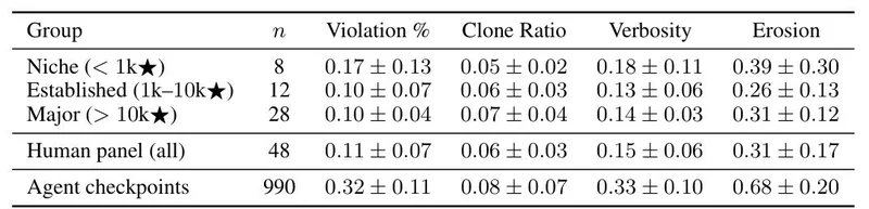 研究者还专门找了48个不同Star量级的Python开源仓库做对比,从几千Star的小工具到scikit-learn、scipy这种明星级项目,结果AI的脸被打得啪啪响: